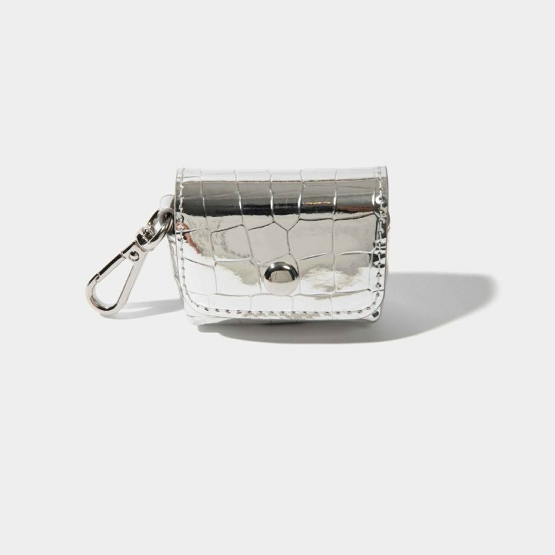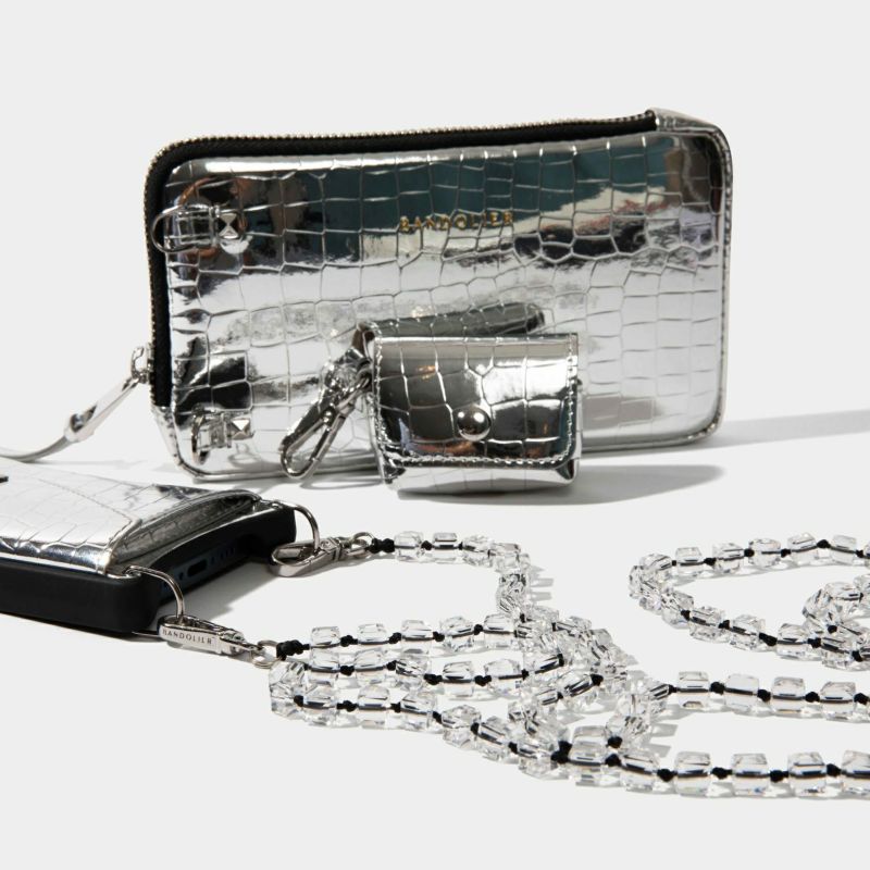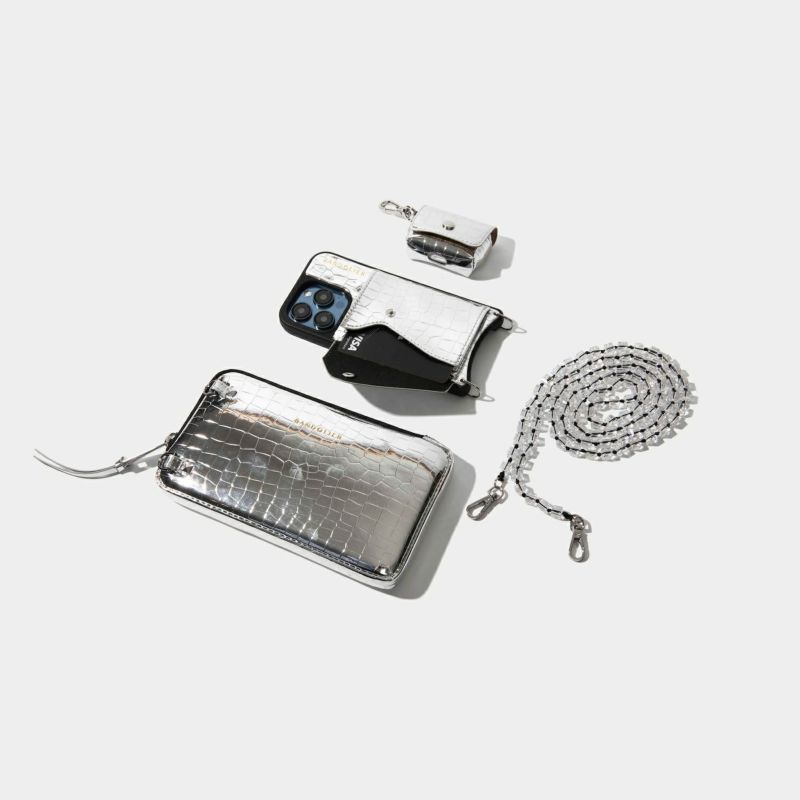 POUCH。なくしやすいAirPodsをスタイリッシュに持ち運ぶために考え抜かれたデザイン。ケースはもちろん、バッグにも取付可能な金具付き。宝石のクリスタルのように輝きを放つケース。