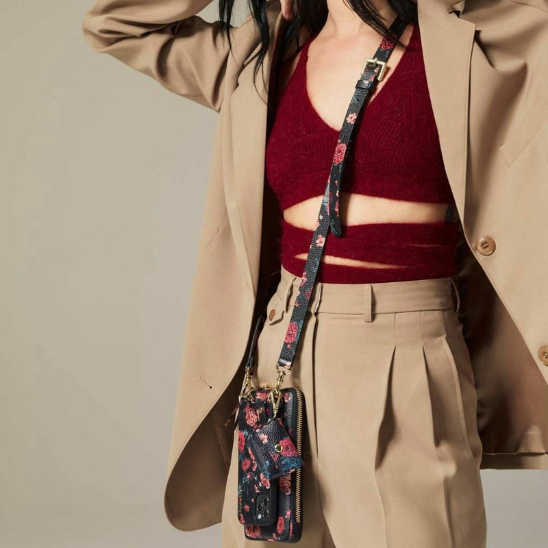 こちらはブラックフローラルのケースにゴールドの金具を組み合わせています。
