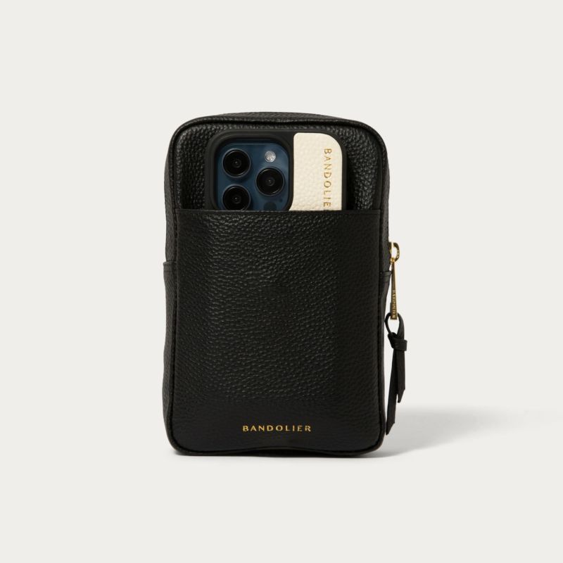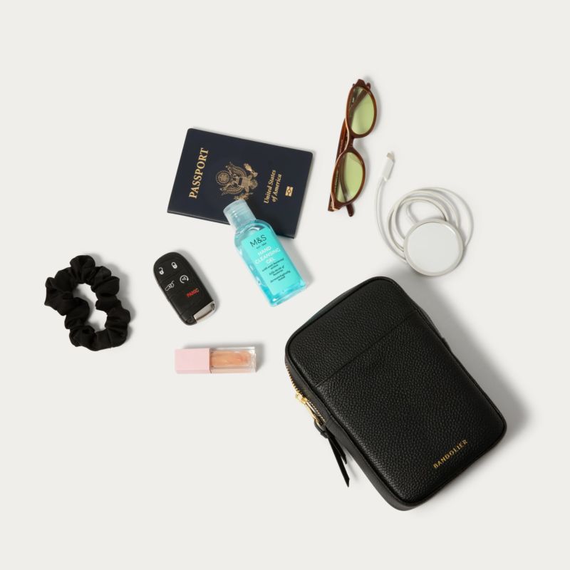 ゴールド金具付きの上質なトップグレインレザー製で、パスポート・財布・充電器などをすっきり収納できる収納力を実現。外側と内側にスリップポケットが装備されており、整理しやすい設計です。Dリング付きで、Bandolierケースやリストレットに取り付け可能。※ストラップ・ケースは別売りです。