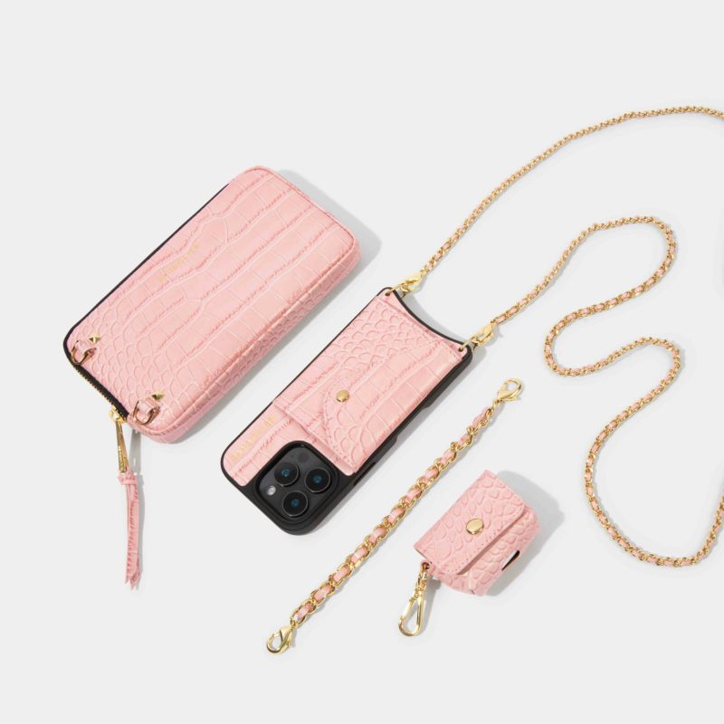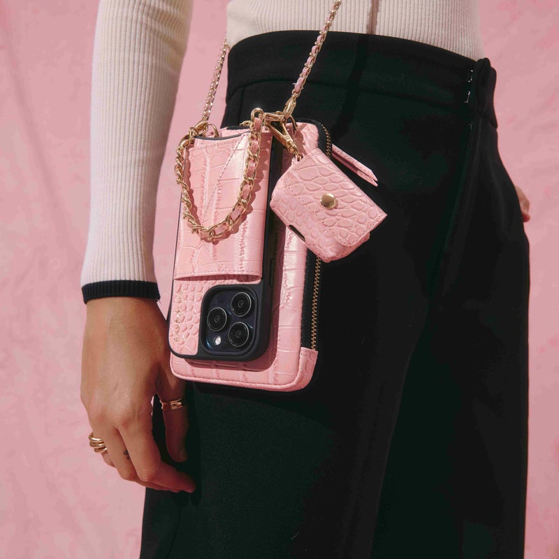 AirPodケースに優しくフィットするように作られたAirPods Pro POUCH。長く使い込むほど美しく変化するクロコダイル調レザーを使用したタイムレスアイテムです。カラーはファッションのアクセントにもなるクロックピンク。なくしやすいAirPodsをスタイリッシュに持ち運ぶために考え抜かれたデザイン。ケースはもちろん、バッグにも取付可能な金具付き。
