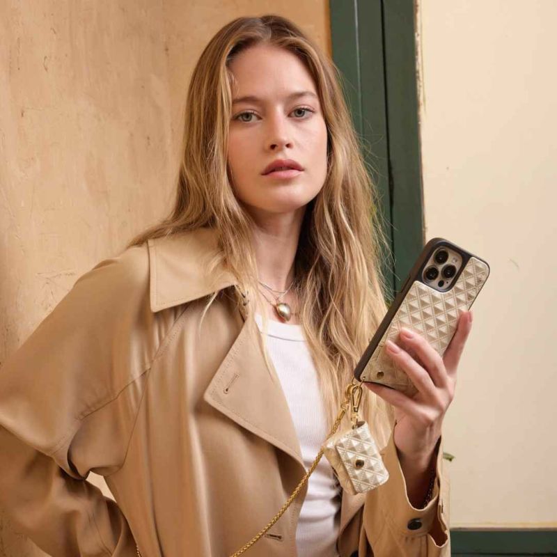 クリームカラーのピラミッドスタッズがファッションのワンポイントに。同色のケースと組み合わせたカスタマイズもオススメ。