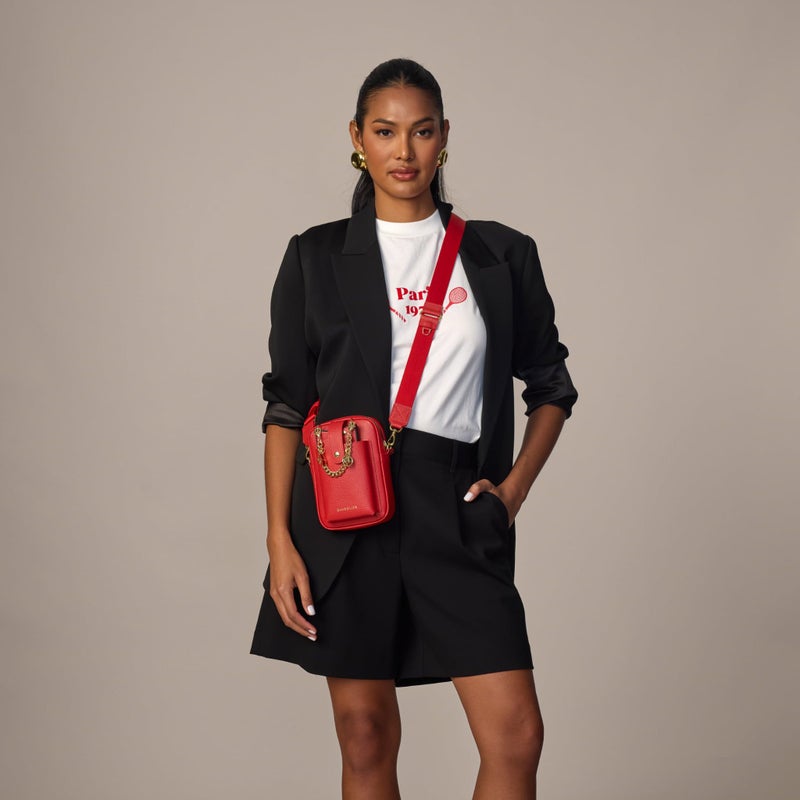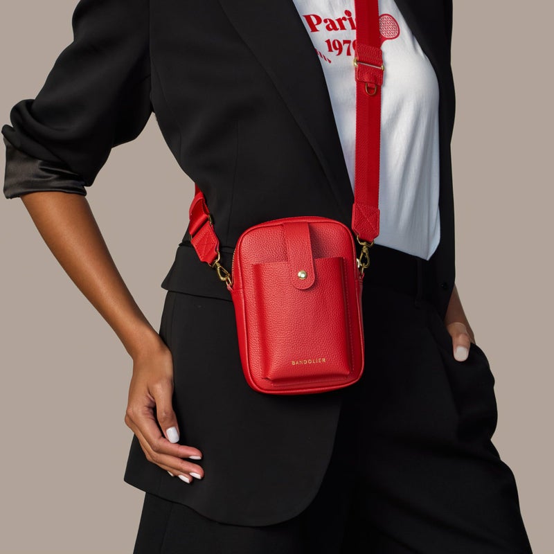 ぺブルレザー素材のクロスボディバッグに、鮮やかなトゥルーレッド×ゴールド金具の組み合わせが目を引くモデル。トップジップ開閉で安心感のあるデザインです。