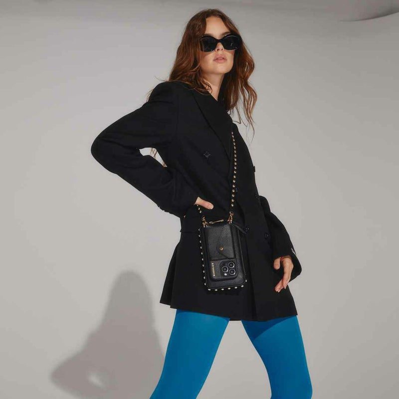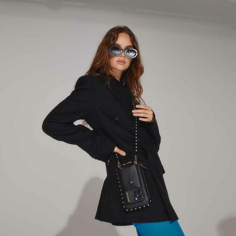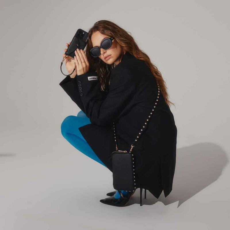 ケースと一緒に持ち歩きできる便利なマチ付きベーシックデザインポーチ。ポーチと同様のラウンド型スタッズ付きのストラップのANNIEと合わせて。※モデル着用画像は一例です。※個体ごとに若干の誤差がある場合がございます。商品の画像は、できるだけ近いカラーにて、掲載をしております。※お客様のモニターの設定により、色味に違いが発生してしまう場合もございます。