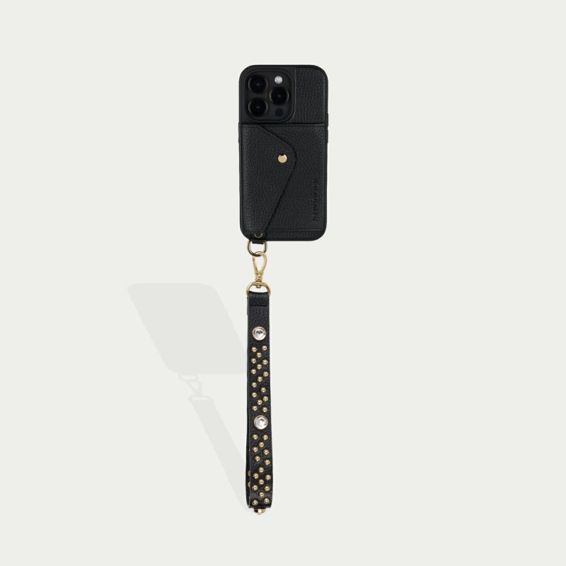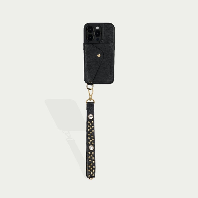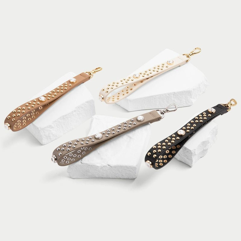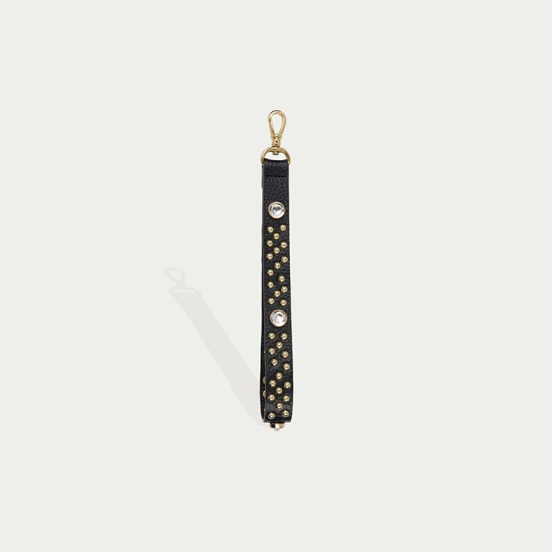 クリスタルとメタルのスタッズで飾られたレザーストラップ。