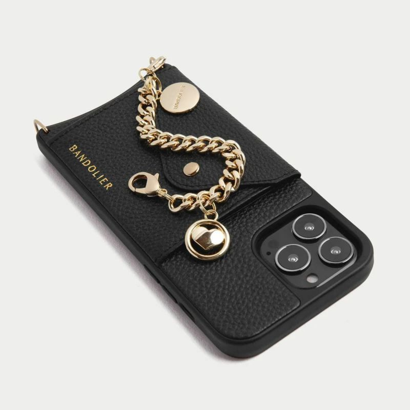ハートとブランドロゴの2つのチャームがついたチェーンストラップ。