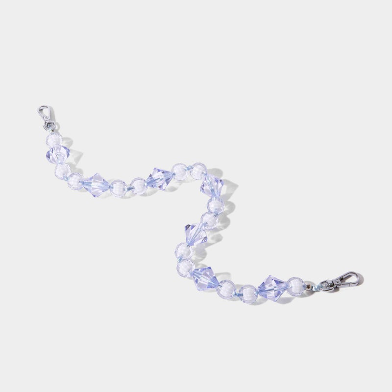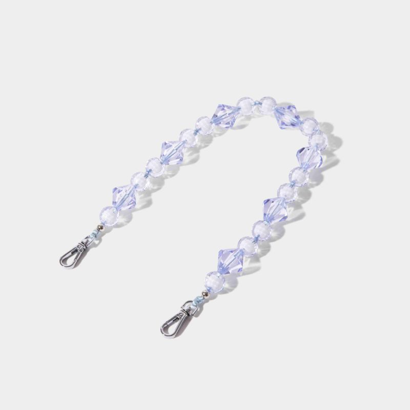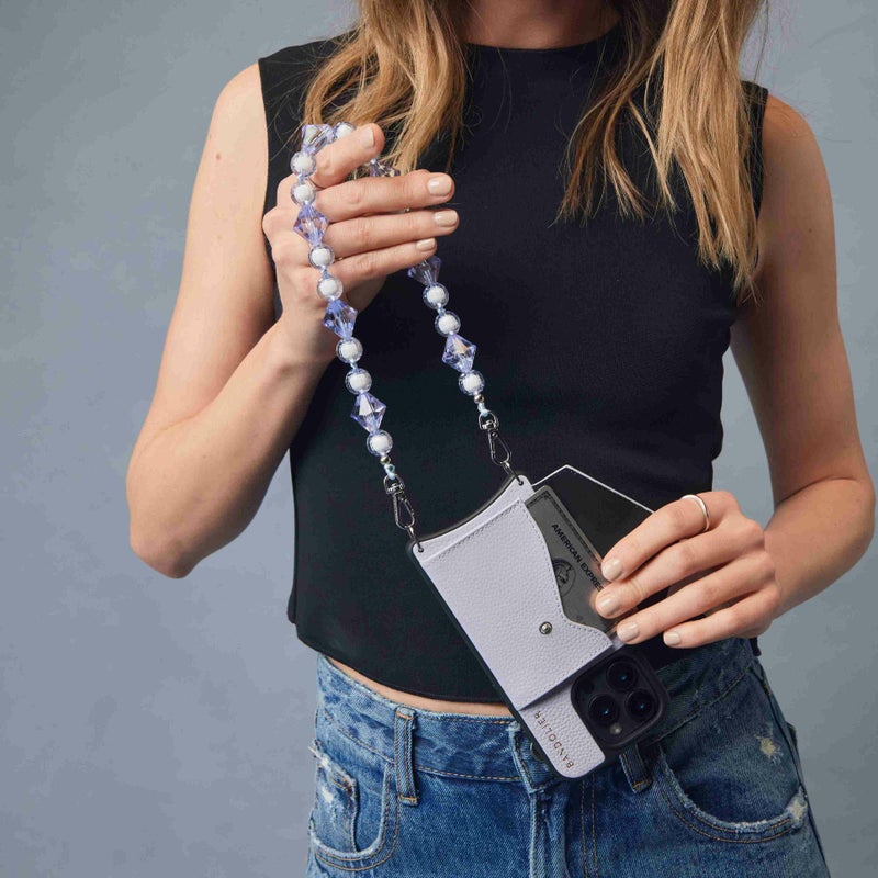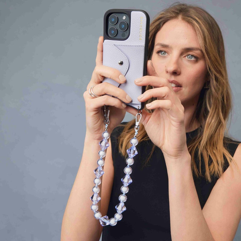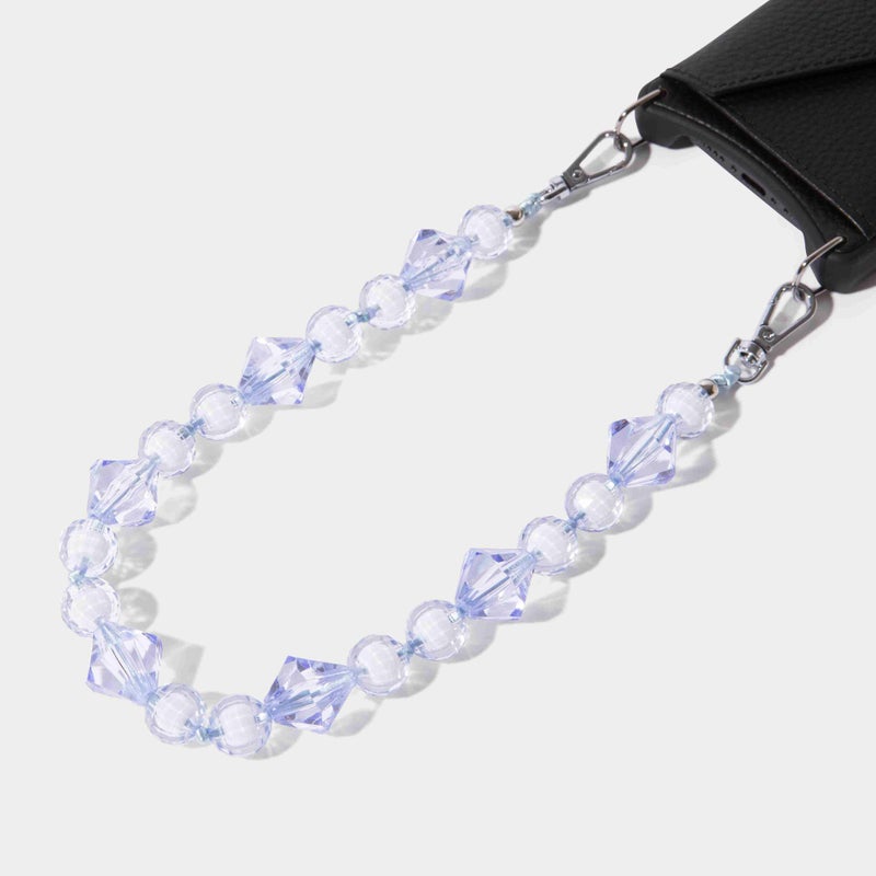 ジュエリーのように美しい透明ビーズをあしらったロングバンドレットスタイル。ボリューム感のあるストラップは、持っているだけで華やかな印象を与え、どんなスマホケースとも合わせやすいアクセントに。ポーチ単体にも取り付け可能で、あなたらしいBANDOLIER STYLEを楽しめます。