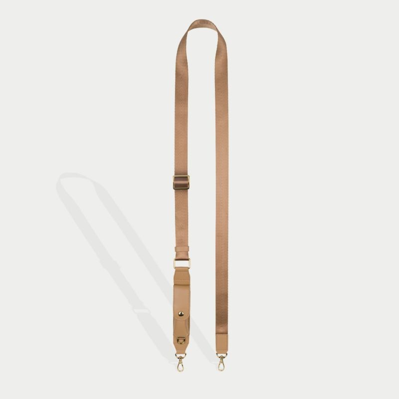 タンカラーのレザーと軽量ナイロン素材の調整可能なストラップに、ゴールドの金具がエレガンスさをプラス。