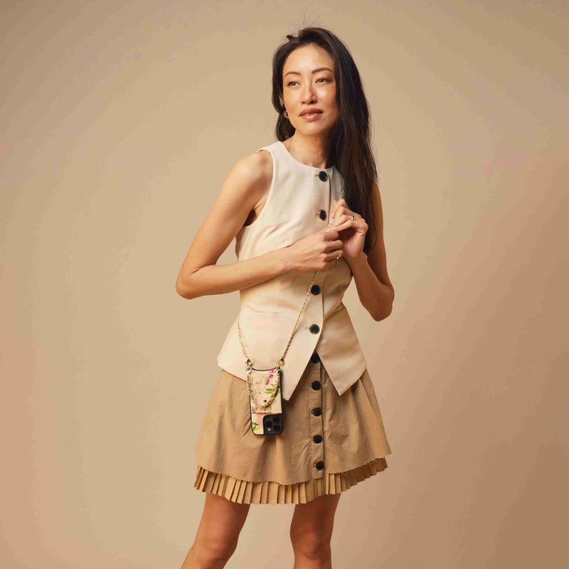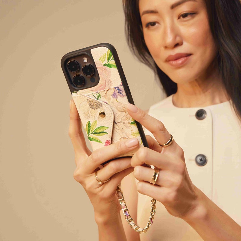 繊細で華やかなアイボリーフローラルプリントが印象的。取り外し可能なクロスボディストラップとリストレット、さらに容量を拡張したポーチ付きで、スマートフォンや現金、カード類をさりげなくスタイリッシュに持ち運べます。