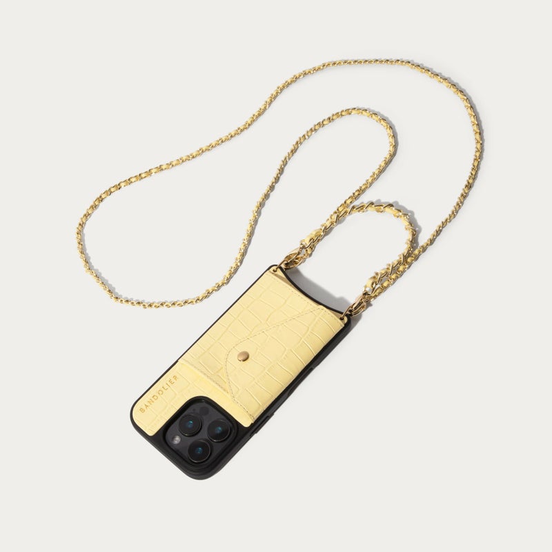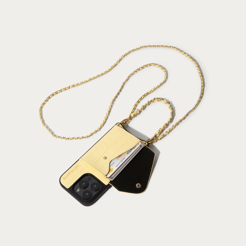 クロコ型押し本革ケースに、クロスボディストラップとリストレットがセットされた3WAY仕様。背面のスリムカードポケットと、エキスパンデッドポーチ付きで、必要な荷物をスマートに持ち運べます。手ぶら派にも優しい利便性と、上品なデザイン性を兼ね備えたアイテムです。