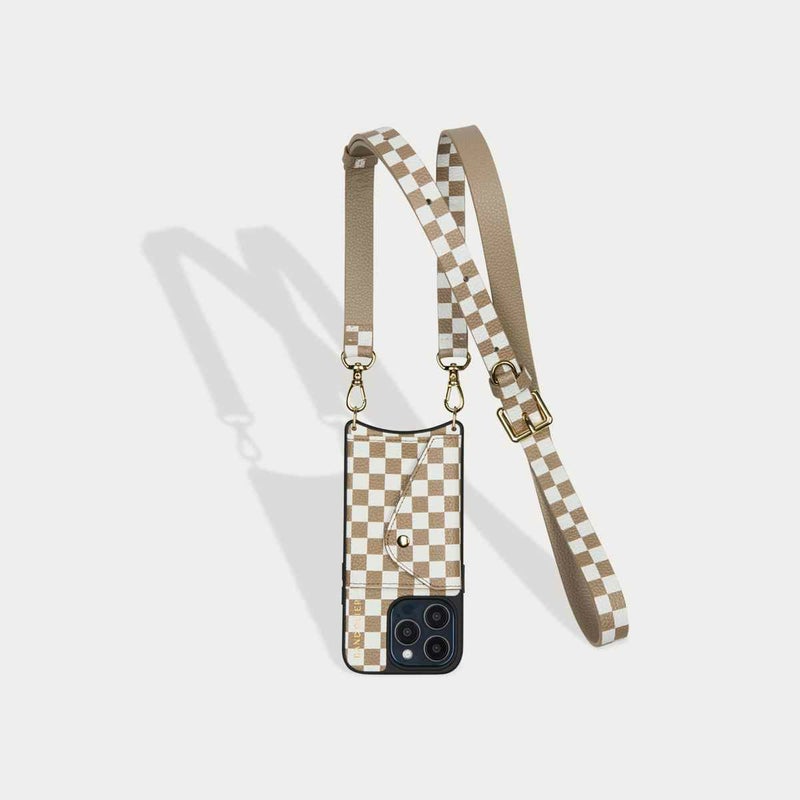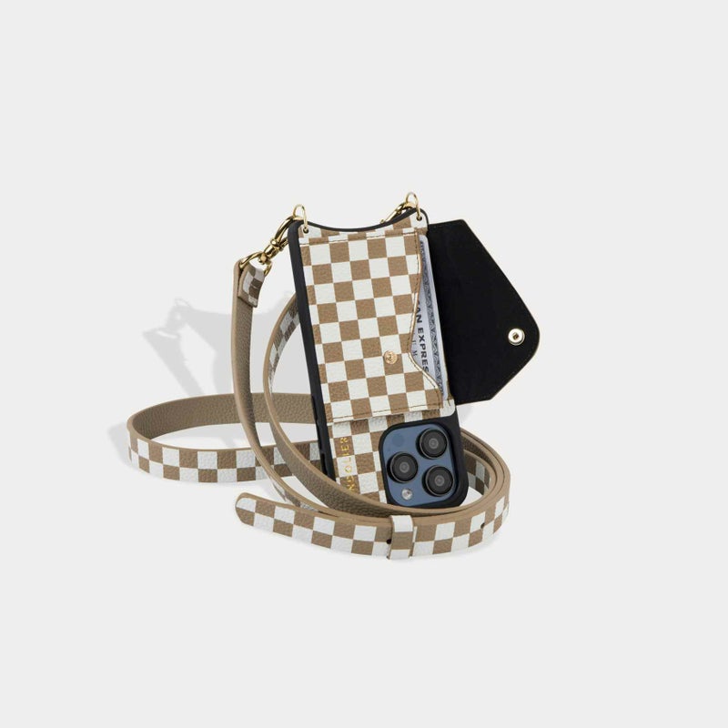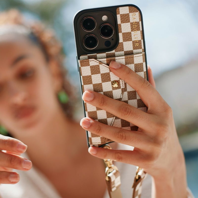 クラッシックなBANDOLIERスタイルをリデザインしたスタイリッシュなチェッカーデザイン。本革かつゴールドの金具で高級感も。最大6枚のカードが収納できる便利なサイドポケット付き。