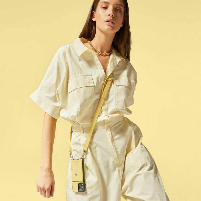 上質なバターイエロー合成皮革ケース × バターイエロー合成皮革ストラップ × シルバーの金具