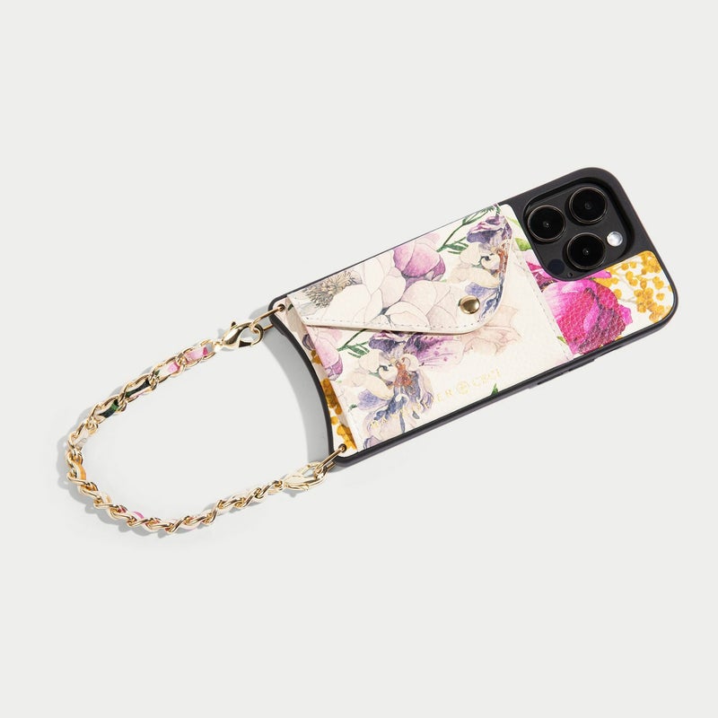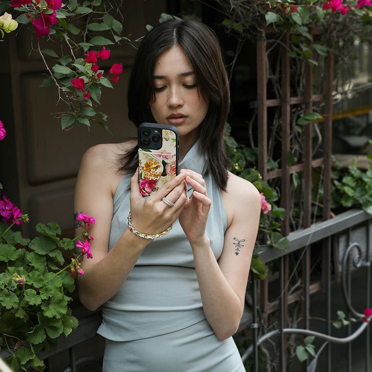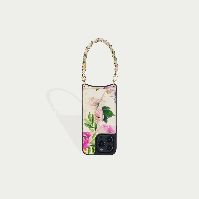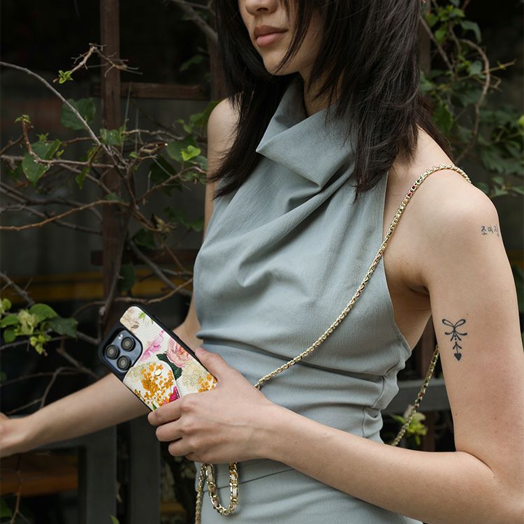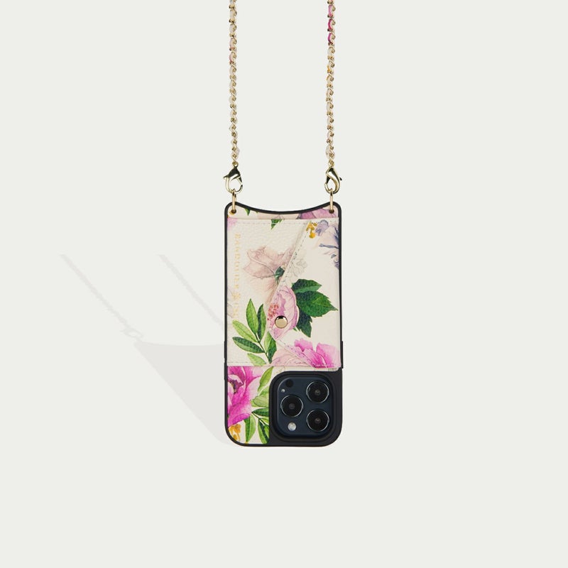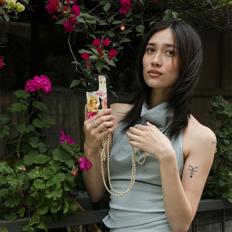 York)とのコラボレーションアイテム。彼女の象徴的でロマンチックな手描きのデザインの花柄プリントを、BANDOLIERのシグネチャーレザーに反映。ムーディな花柄プリントを使用したクラシックなケースと、ゴールドチェーンで編み込まれたストラップで印象的なアイテムに。