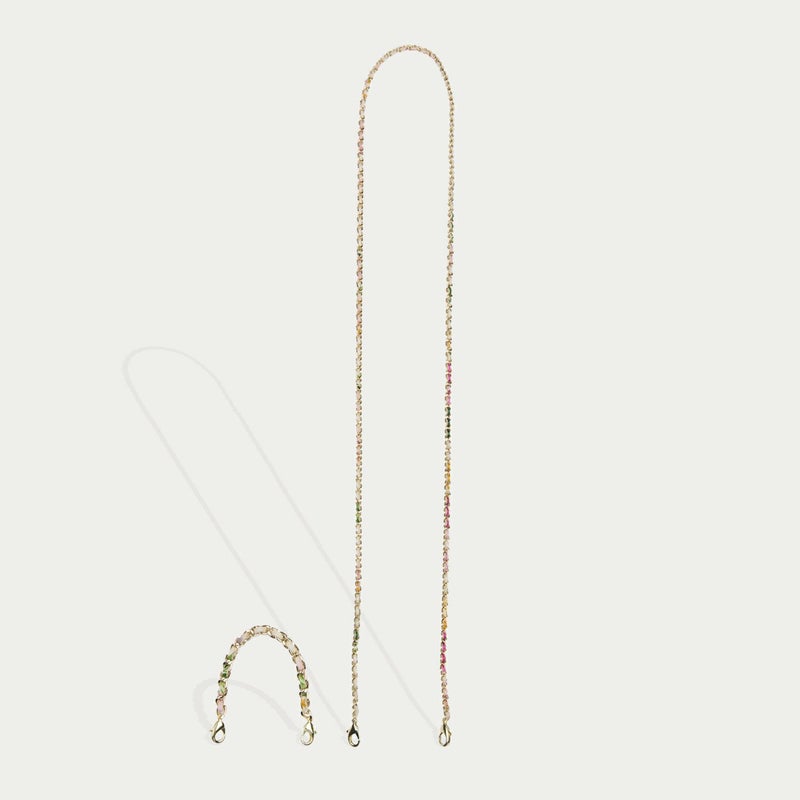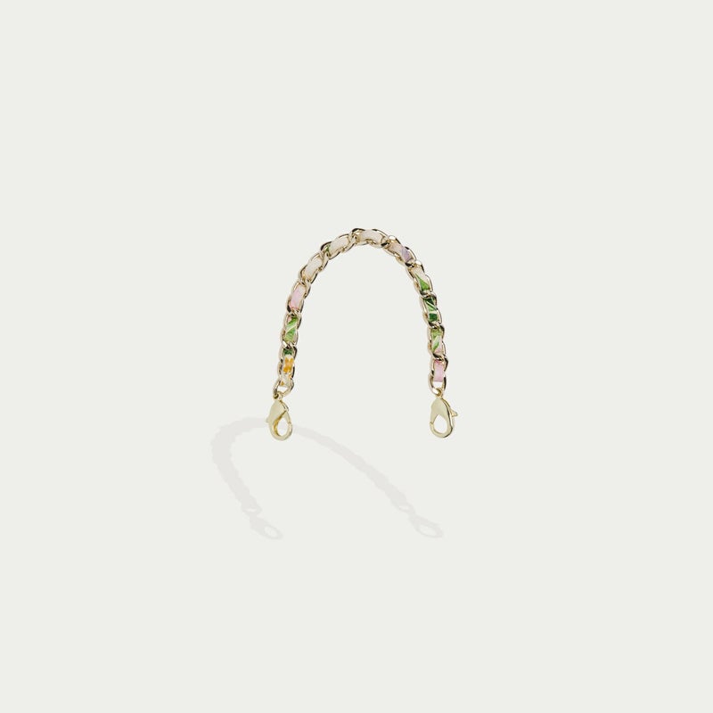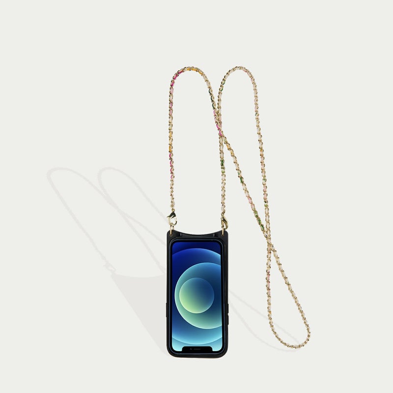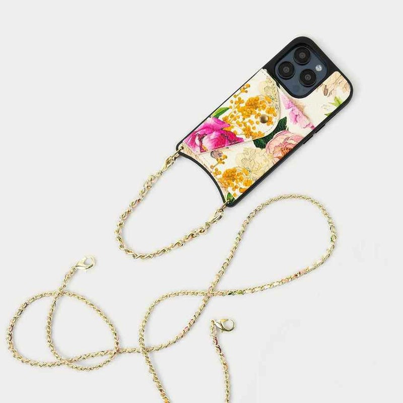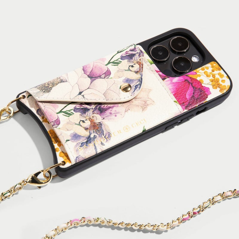 York)とのコラボレーションアイテム。彼女の象徴的でロマンチックな手描きのデザインの花柄プリントを、BANDOLIERのシグネチャーレザーに反映。ムーディな花柄プリントを使用したクラシックなケースと、ゴールドチェーンで編み込まれたストラップで印象的なアイテムに。