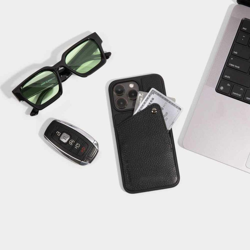 無地でシンプルなブラックレザーが洗練された印象を演出。
