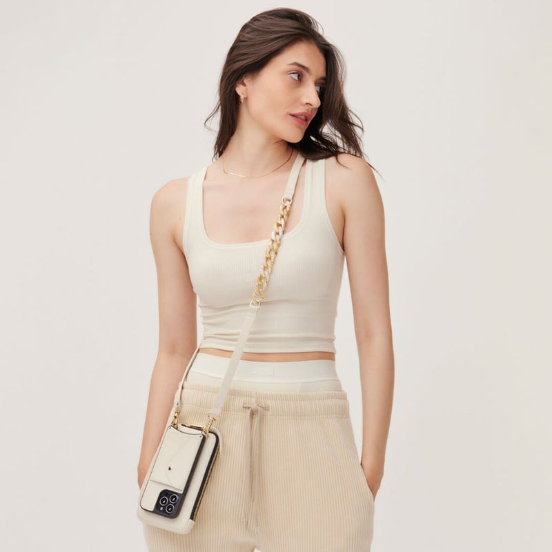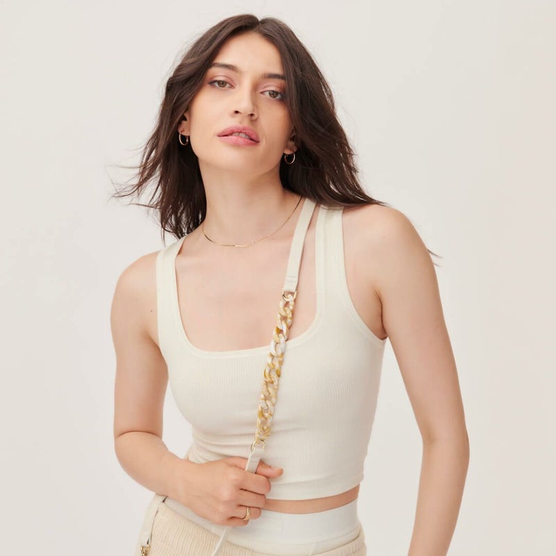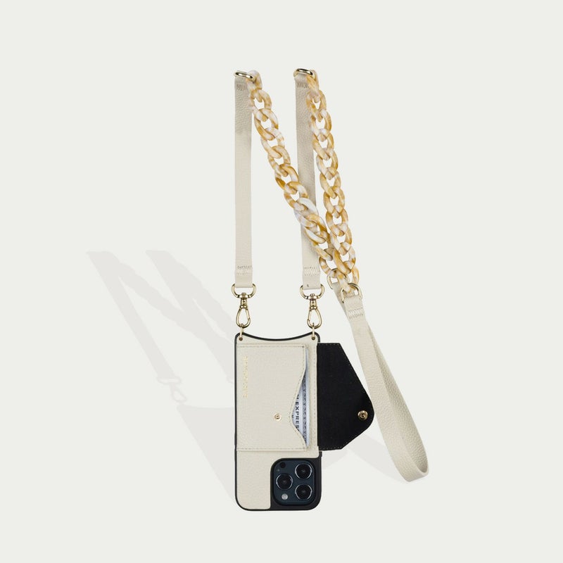 ホワイトレザーにマーブルベージュのべっ甲チェーンがアクセントに。
