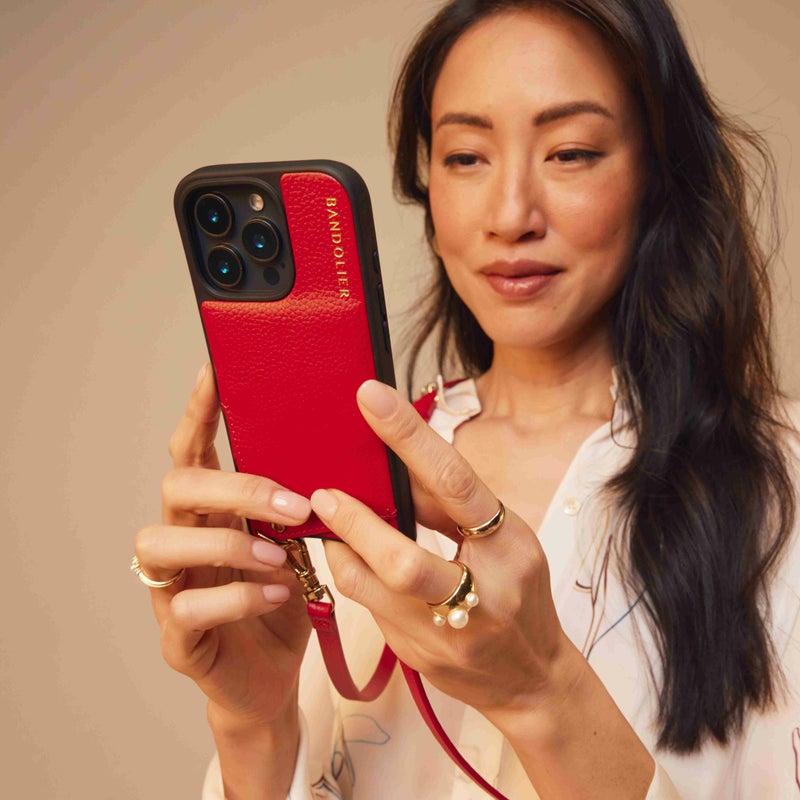 肩から斜めがけできるクロスボディ仕様で、両手が空くため荷物が多い日や旅行先でも大活躍。こちらはREDのケースに、洗練されたゴールド金具を組み合わせたモデルです。実用性とスタイルを兼ね備えた、大人のためのスマホアクセサリーです。