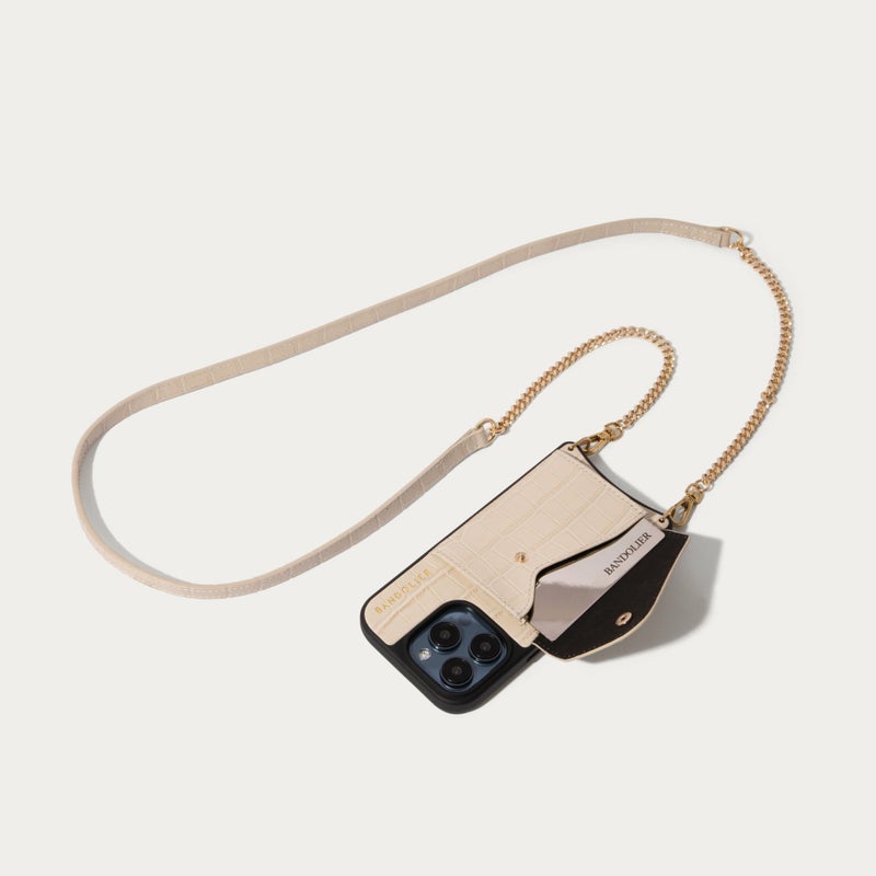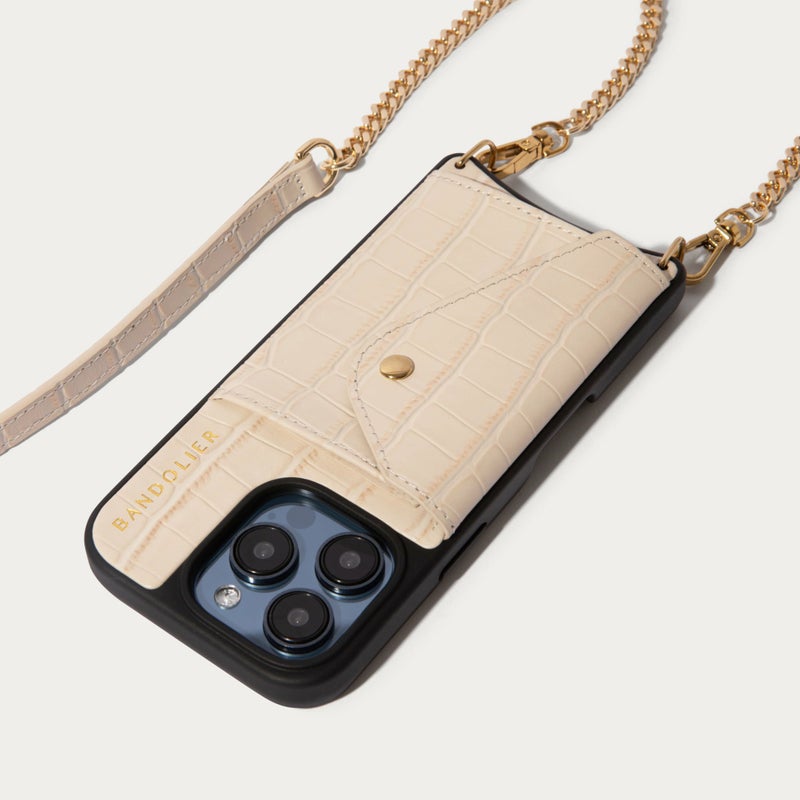 型押しクロコレザーにゴールドパーツを組み合わせたクロスボディフォンケース。