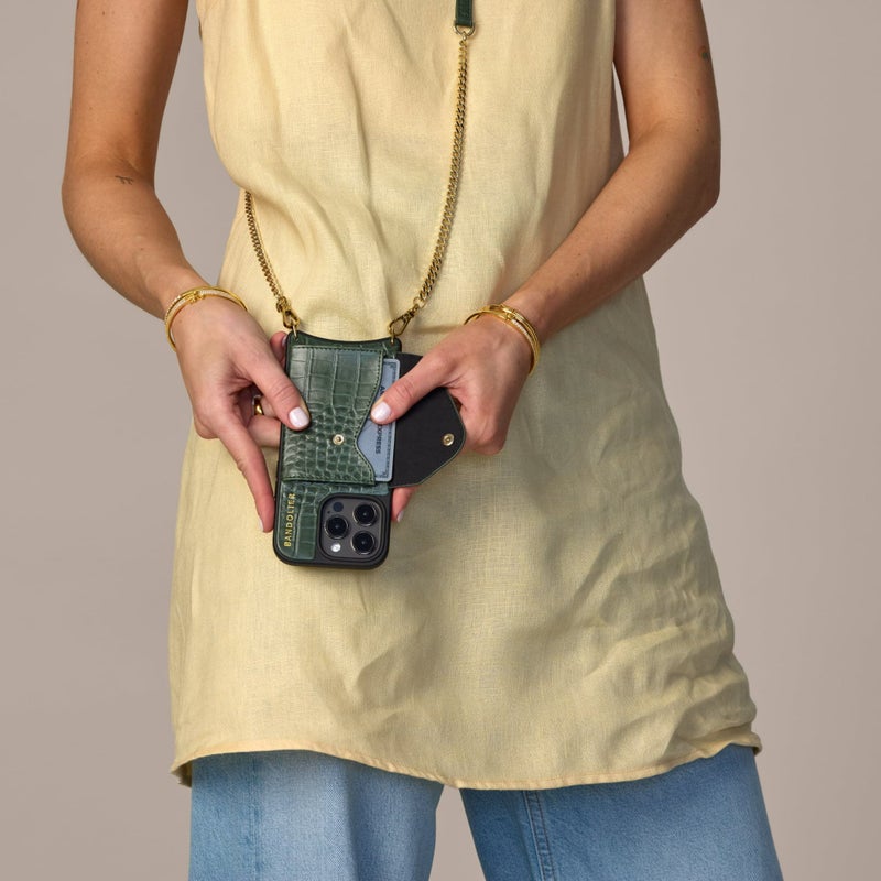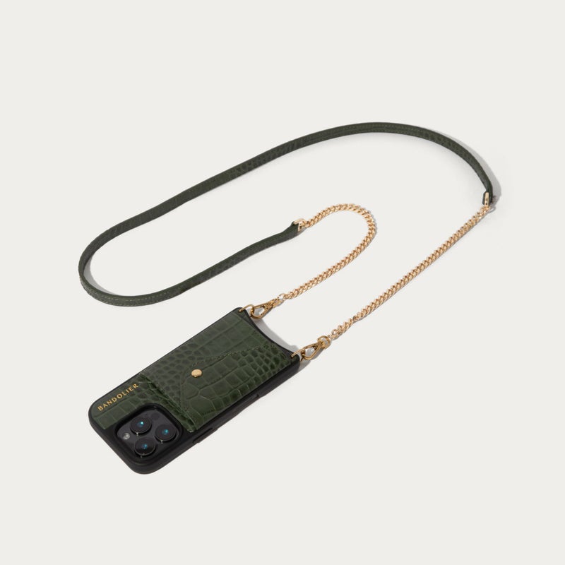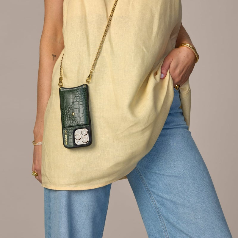 型押しクロコレザーにゴールドパーツを組み合わせたクロスボディフォンケース。
