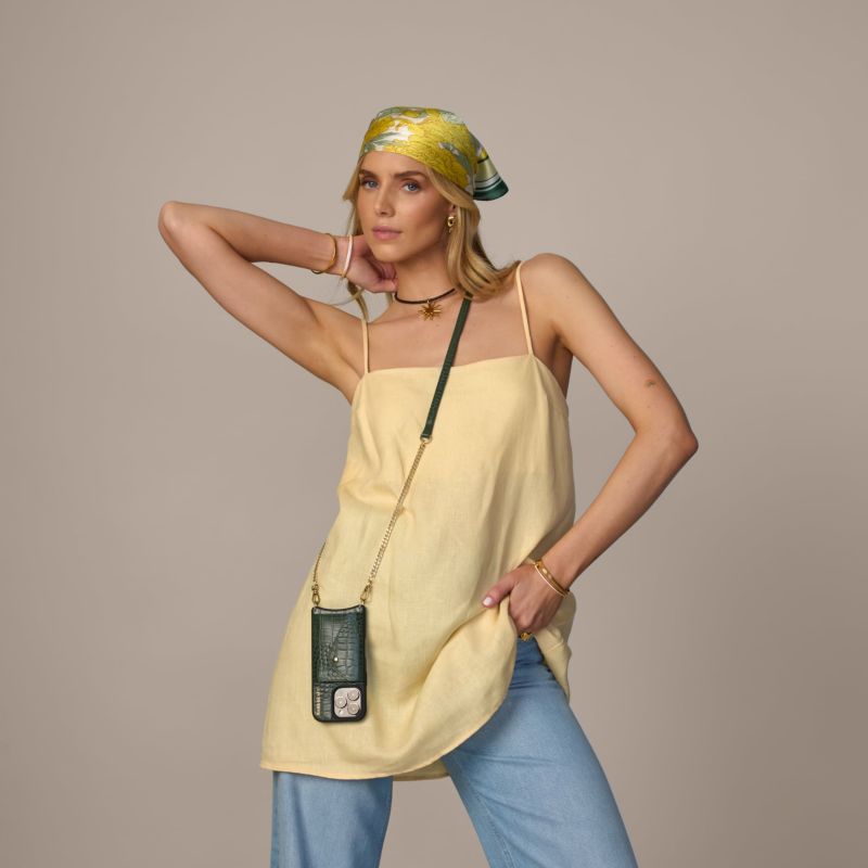 型押しクロコレザーにゴールドパーツを組み合わせたクロスボディフォンケース。
