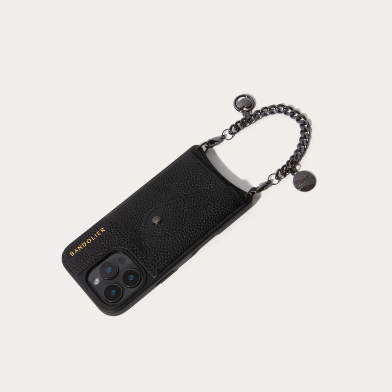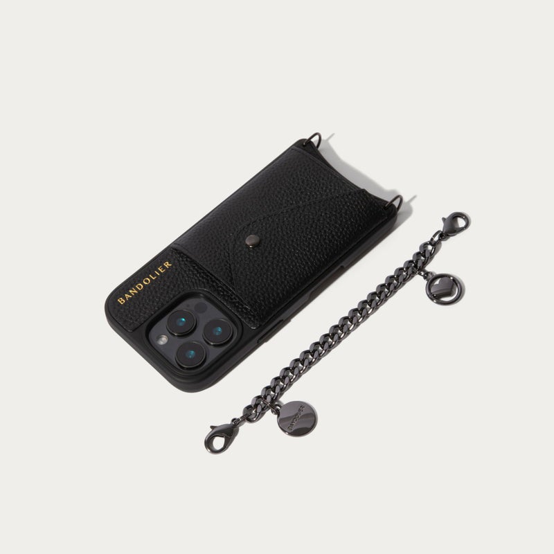 重厚感のあるチェーンストラップと本革ケースがセットになった、洗練されたハンドストラップ付きスマホケース。シンプルながらもエッジの効いたデザインで、手元にラグジュアリーなアクセントを添えます。