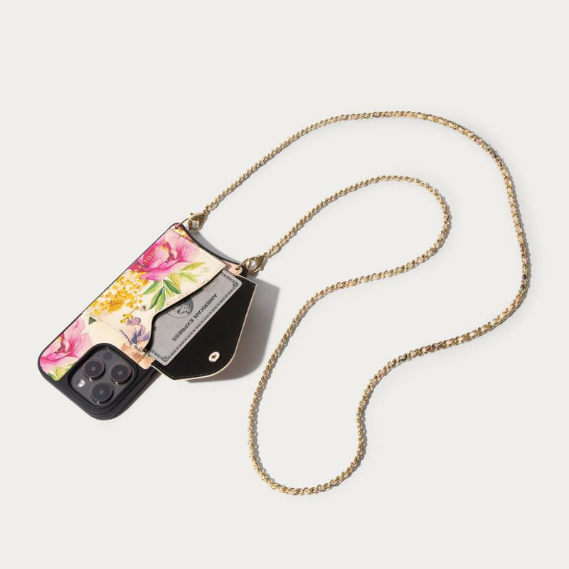 繊細で華やかなアイボリーフローラルプリントが印象的。取り外し可能なクロスボディストラップとリストレット、さらに容量を拡張したポーチ付きで、スマートフォンや現金、カード類をさりげなくスタイリッシュに持ち運べます。