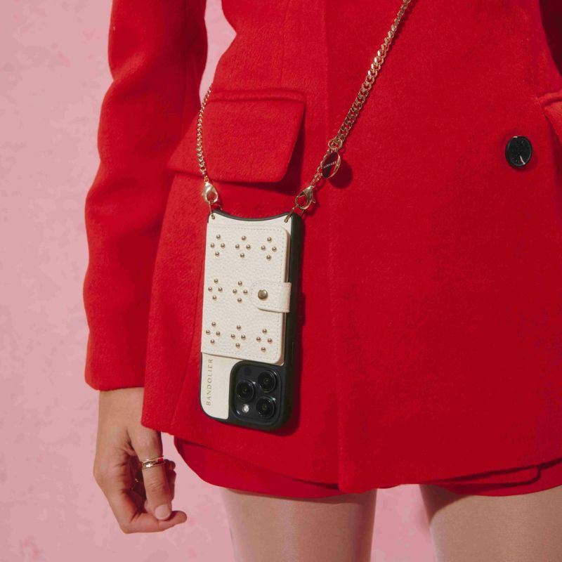 ケース部分をゴールドラウンドスタッズでダイヤモンド形パターンにデザインし、チェーンタイプストラップでさらに愛らしい印象に。MagSafe(ワイヤレス)充電対応で、最大3-4枚のカードが収納可能な背面ポケットは、携帯スタンドとしてもご使用頂けます。