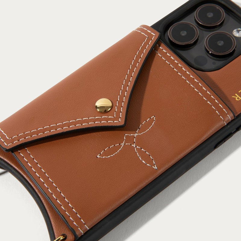 温かみのあるオレンジがかったブラウンカラーを基調としてケース。サイドポケットには、デザイン性のあるステッチを施し、遊び心を取り入れました。