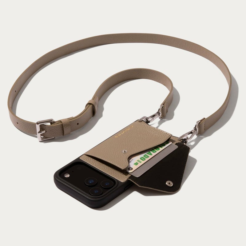 どんなファッションにも合わせやすいベーシックレザーストラップデザイン。 携帯を無くさず、落とさず、ファッショナブルに。どんな服装の日でもスマートフォンを肌身離さず持ち歩くことができます。 肩から斜めがけができ両手が空くので、荷物の多いときや旅行にもおすすめです。 こちらはグレージュのケースにシルバーの金具を組み合わせています。