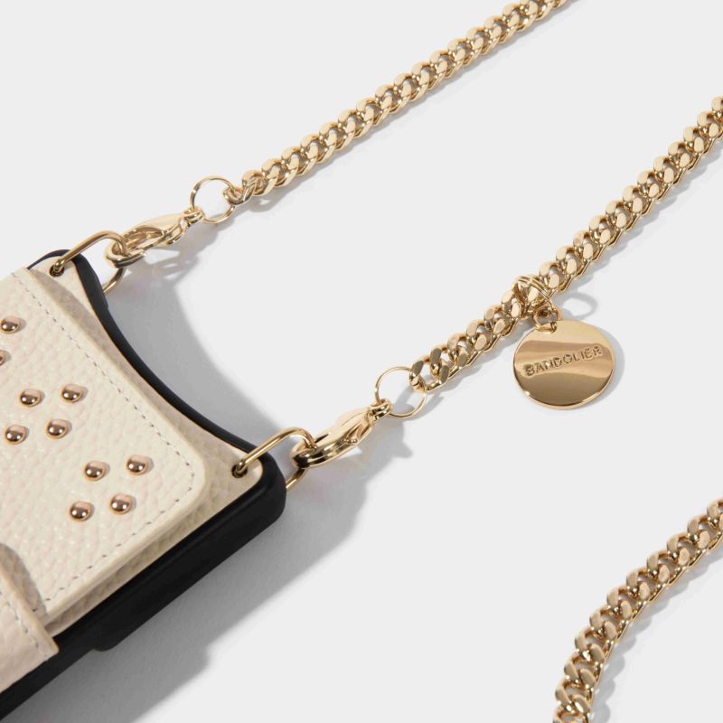 ケース部分をゴールドラウンドスタッズでダイヤモンド形パターンにデザインし、チェーンタイプストラップでさらに愛らしい印象に。MagSafe(ワイヤレス)充電対応で、最大3-4枚のカードが収納可能な背面ポケットは、携帯スタンドとしてもご使用頂けます。