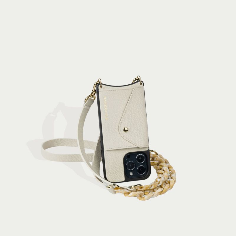 ホワイトレザーにマーブルベージュのべっ甲チェーンがアクセントに。