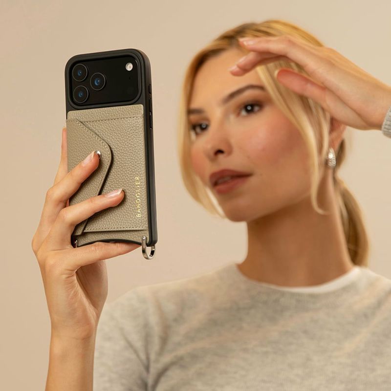 どんなファッションにも合わせやすいベーシックレザーストラップデザイン。 携帯を無くさず、落とさず、ファッショナブルに。どんな服装の日でもスマートフォンを肌身離さず持ち歩くことができます。 肩から斜めがけができ両手が空くので、荷物の多いときや旅行にもおすすめです。 こちらはグレージュのケースにシルバーの金具を組み合わせています。